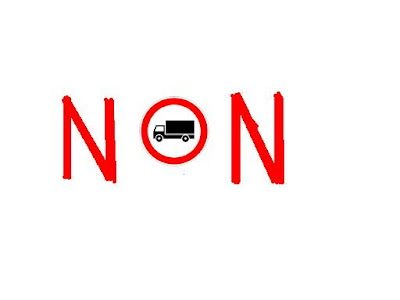 1º estão contra o trânsito de camiões, daí o não (non) e o sinal lá no meio